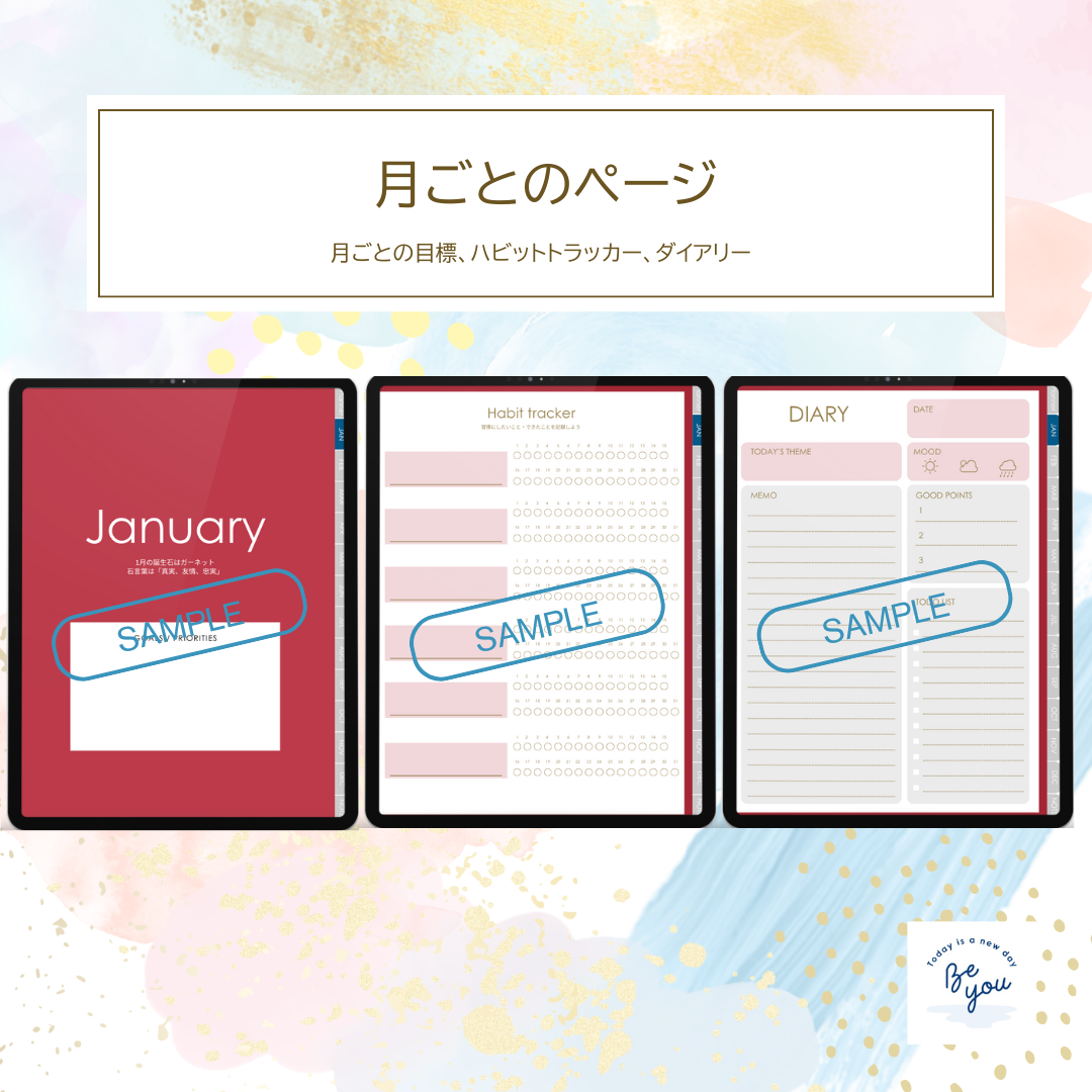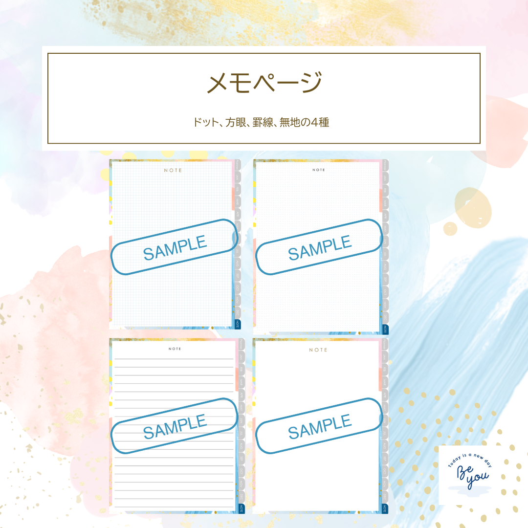 毎日書きたくなるような可愛いデザインで、ipadのメモアプリ(Good notes)に取り込んでコピーをするだけで毎日のページを増やせたり、コピーしてノートに貼ったりことで、あなただけのノートに。